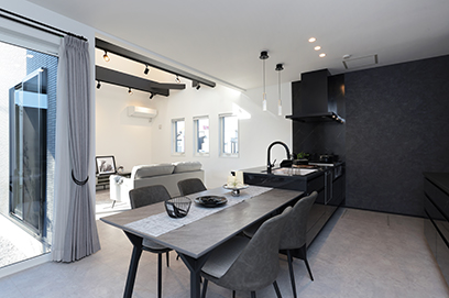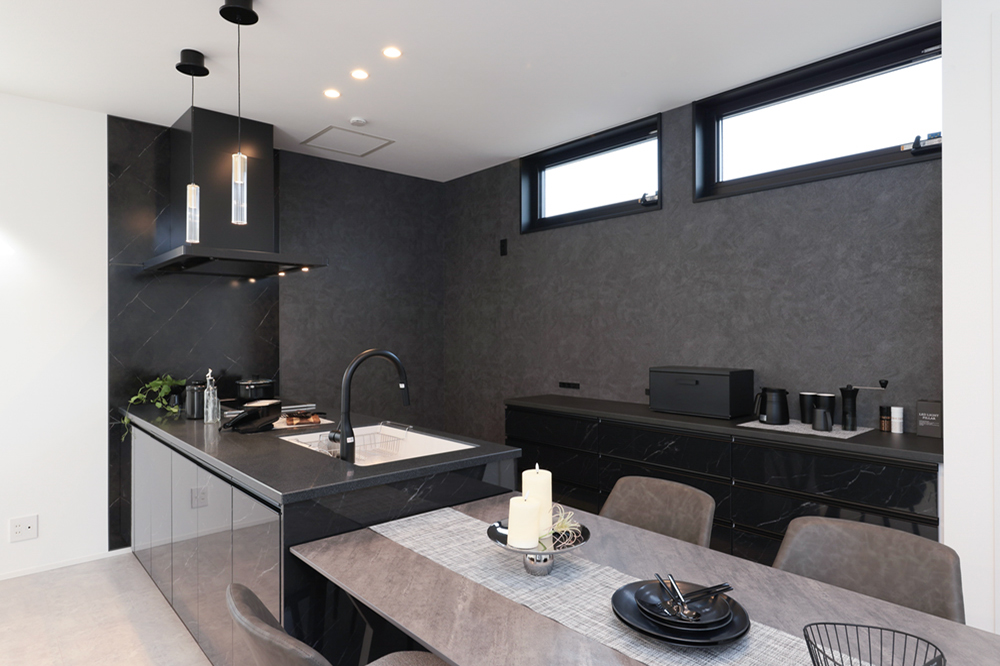 モノトーンを基調としたダイニングキッチン、スイートルームのような洗練された上質なデザイン。
