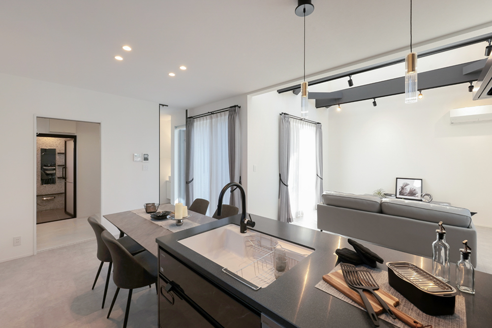 モダンで白を基調とした、ダイニングキッチンとリビングルームが一体となった空間。ダークグレーの家具とペンダントライトがアクセント。