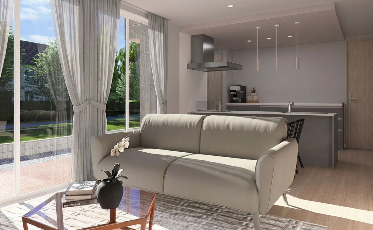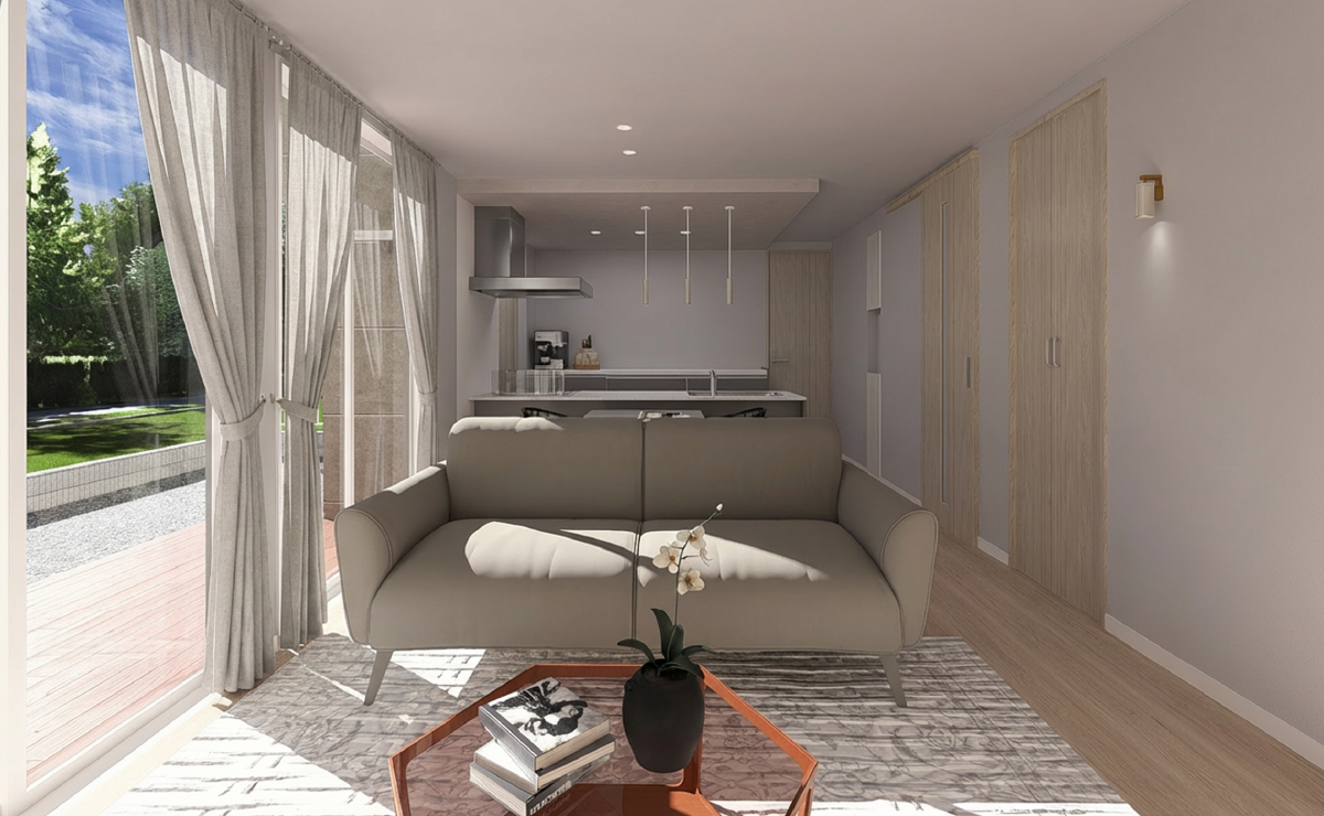 落ち着いたグレージュカラーと木目が織りなすやさしい空間に、やわらかな光が差し込むリビング。