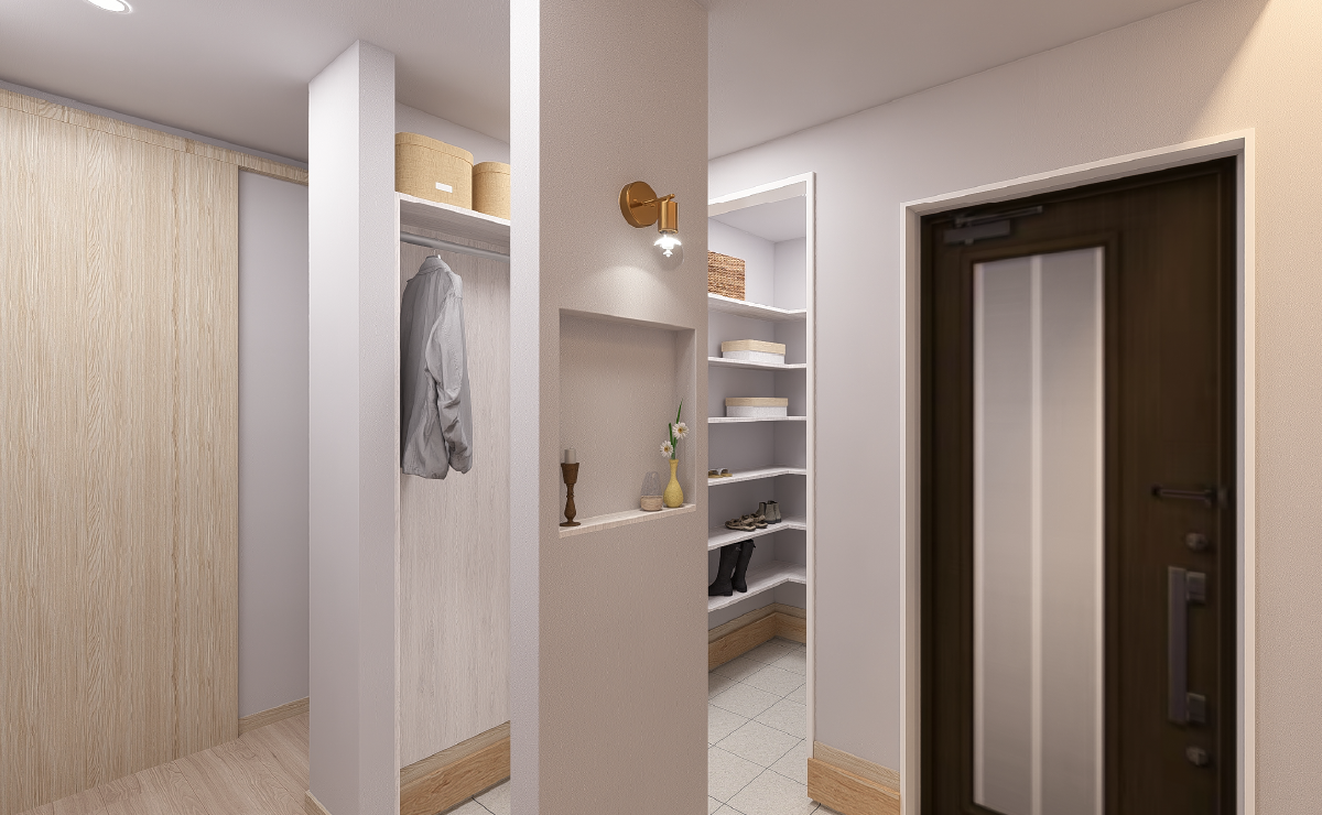 来客用と家族用で使い分けられる2way玄関。 ハンガー付きで、コートや上着をさっと掛けられるから、外から帰ってきた動作もスムーズ。 ニッチには季節感のある小物やグリーンを飾って、玄関にさりげない彩りを添えられます。