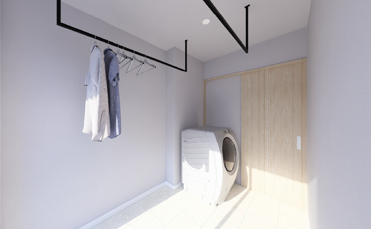 動線をじゃましない位置で干せるよう計画されたランドリールーム。 凹凸を極限まで無くしたシンプルな物干しを採用し、壁や天井、窓枠などがつくる水平・垂直のラインに美しく馴染むように整えています
