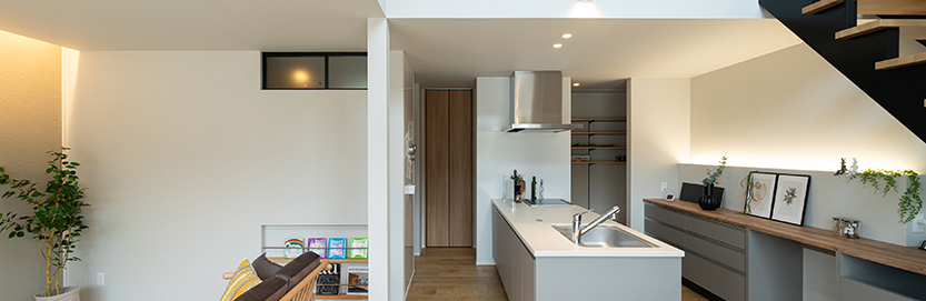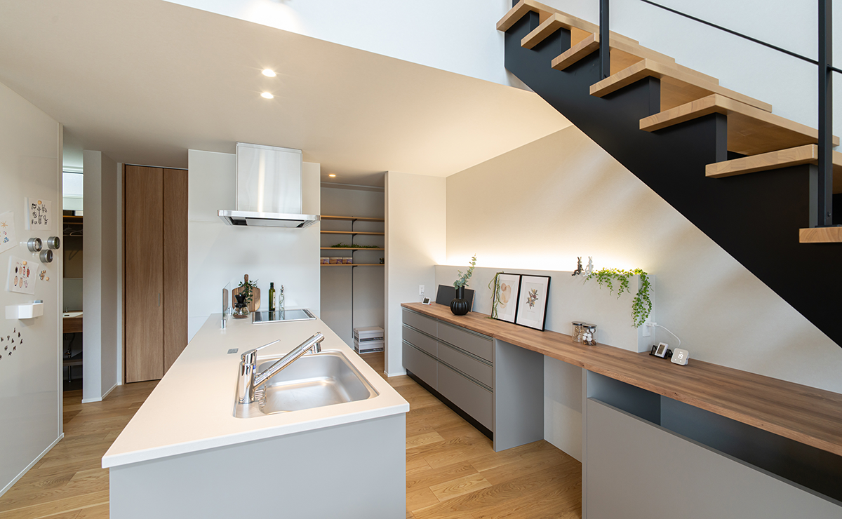 背面の間接照明が印象的なキッチン。デザイン性にも機能的にも優れた、家族が集うキッチンに。