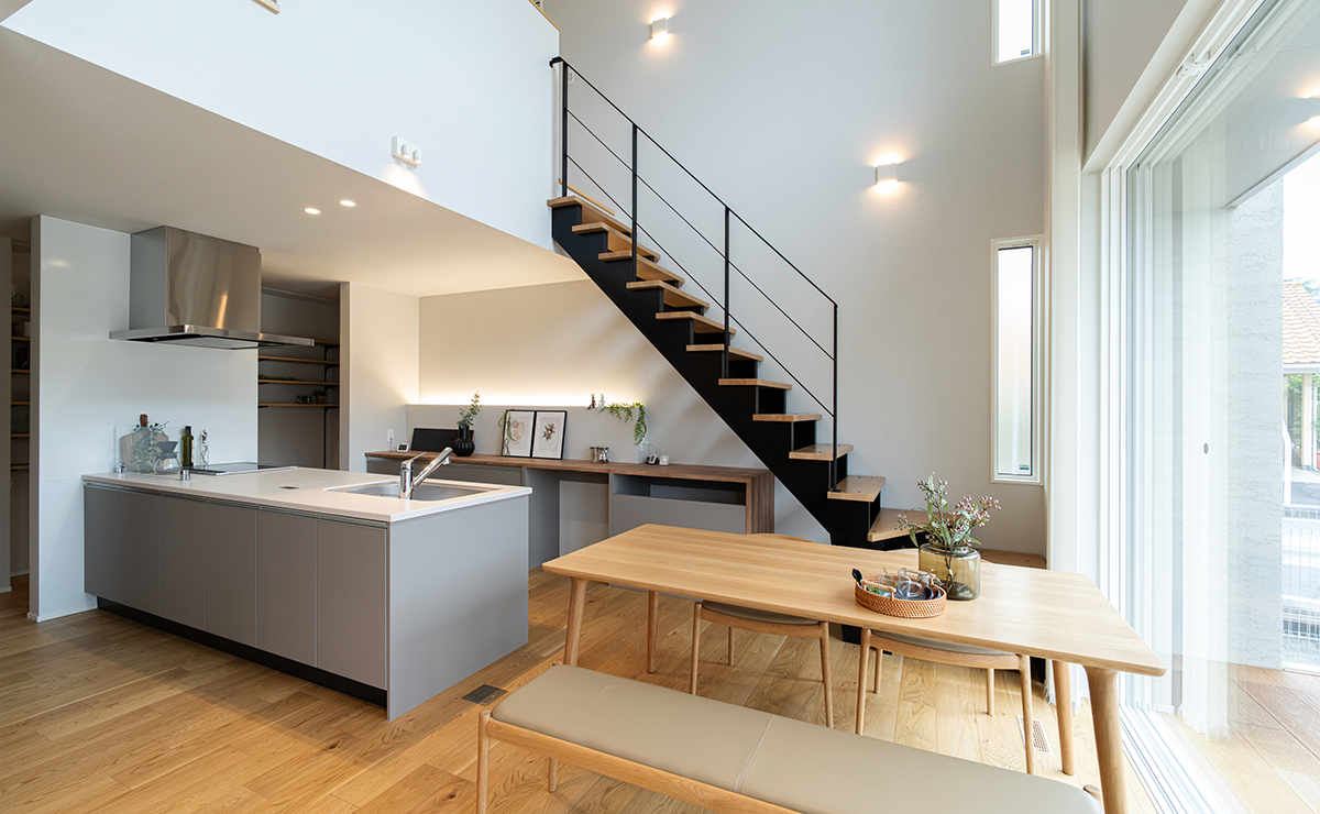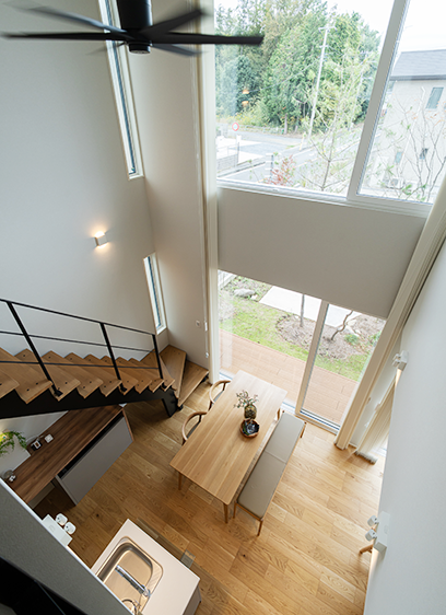 大開口の窓と吹き抜けを通るオープン階段。心地良い陽光がLDK全体を明るく開放的に演出します。