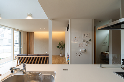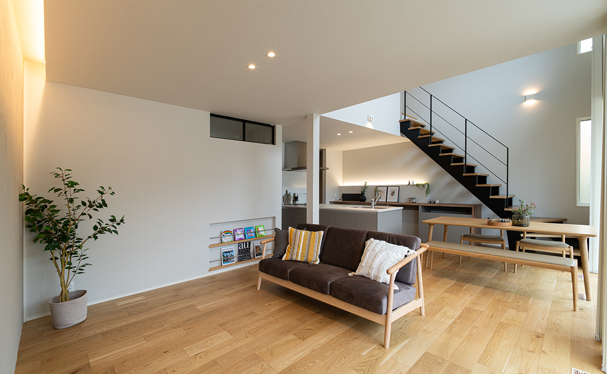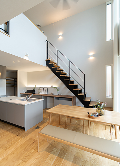 自然光や風を最大限に活かすよう計算され尽くされた設計でありながら、 吹き抜けやオープン階段などのデザイン性を両立し、心地よく洗練された空間に。 内装は心地良い暮らしを邪魔しない、すっきりとしたデザインで良質な素材感を引き立てます。