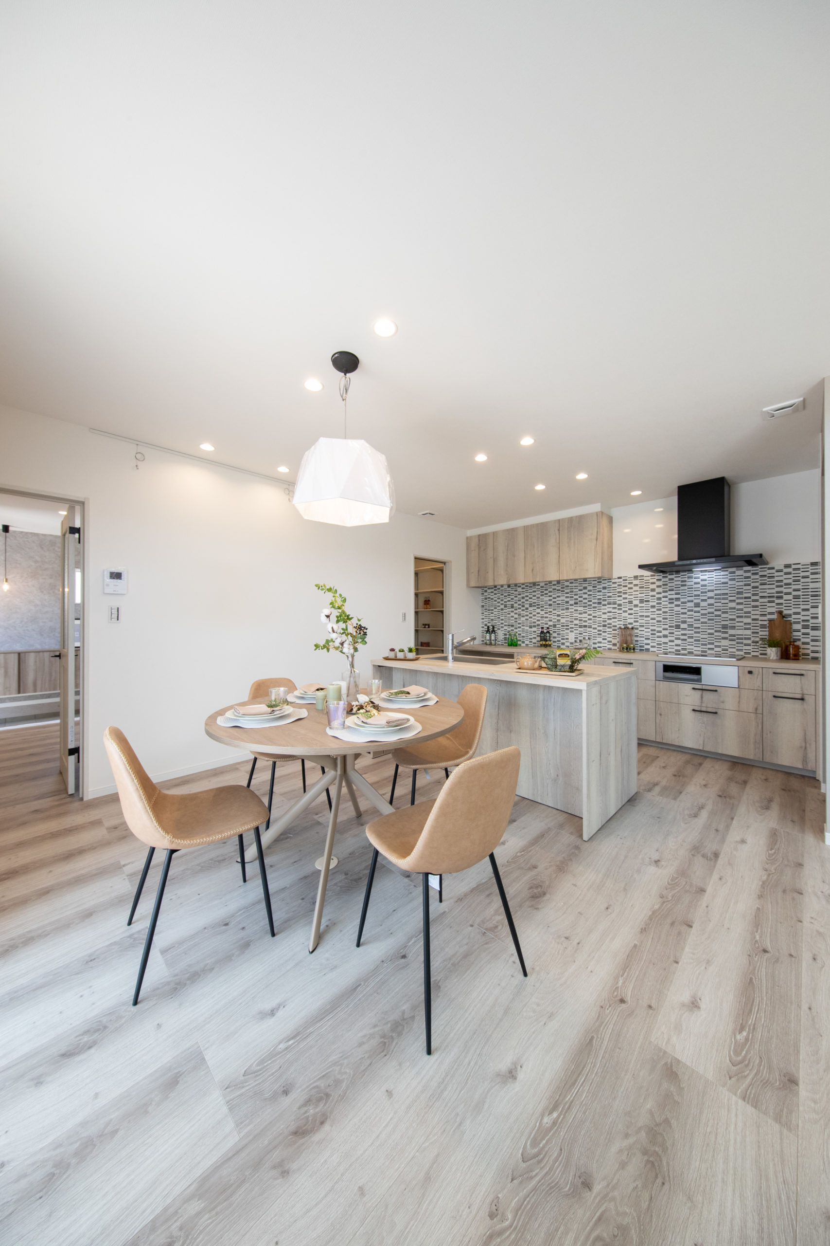 会話がしやすい丸いダイニングテーブル。床にはアップコンセントがついているので、ホットプレートなどの使用時に便利です。