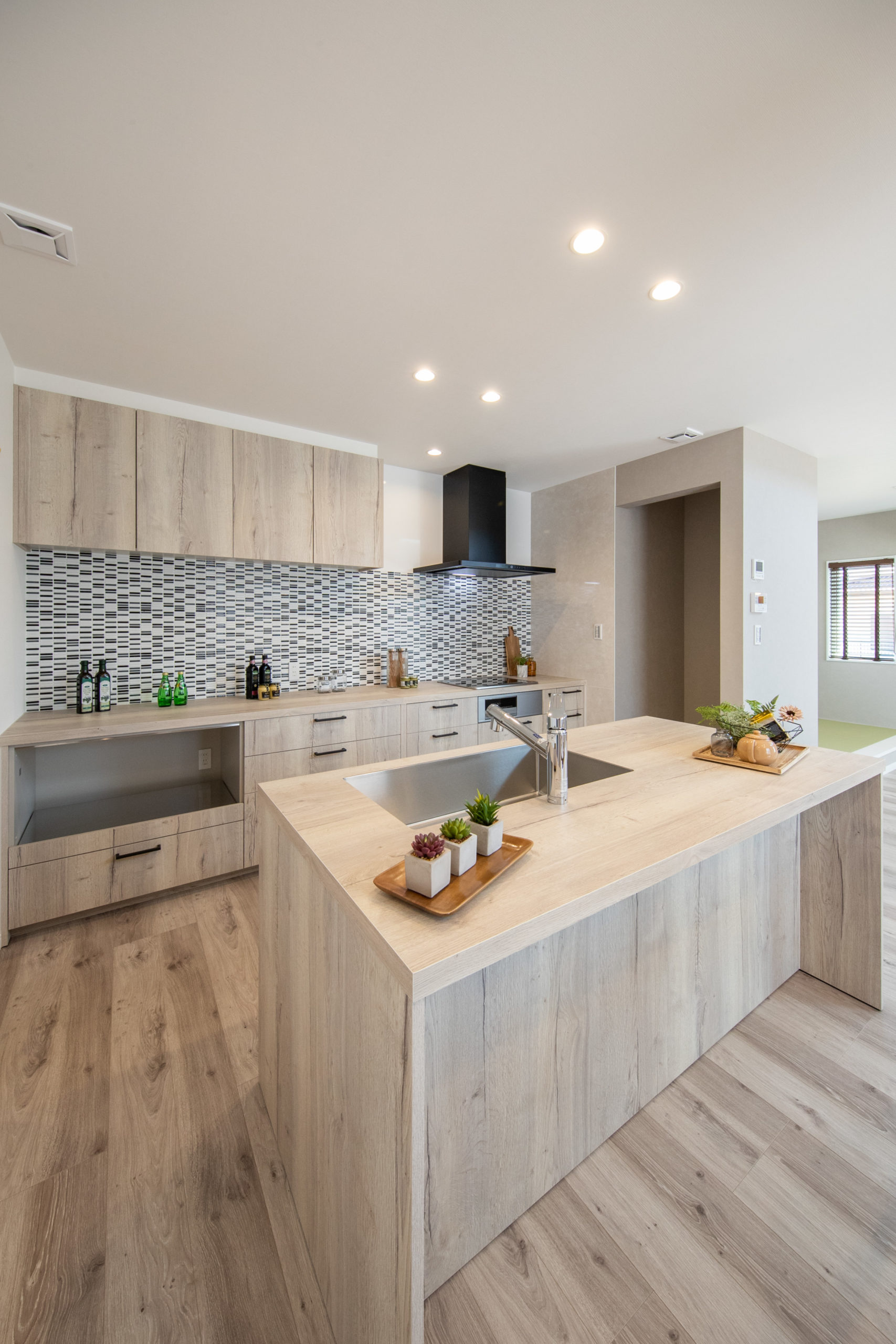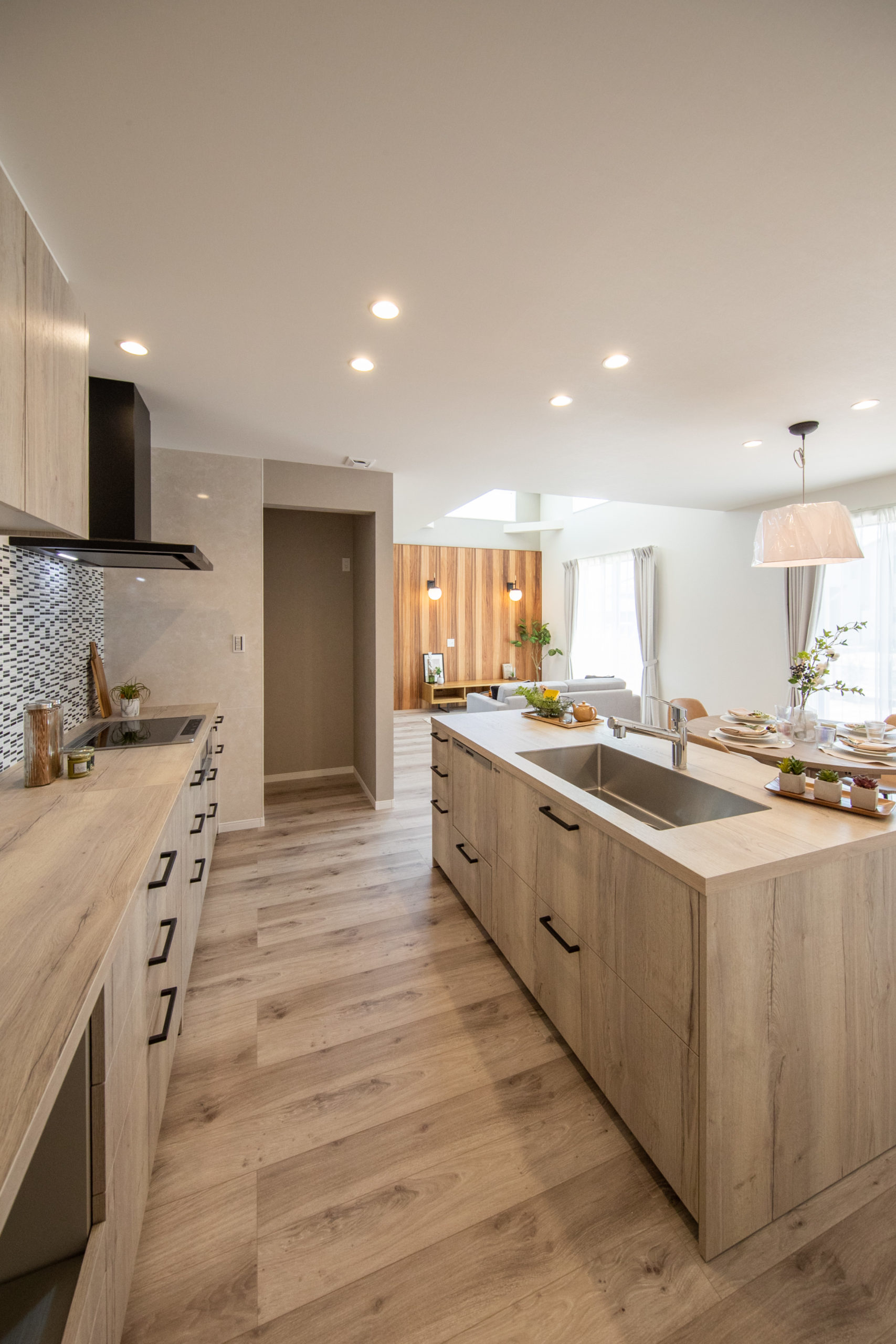 キッチンは二の字型にすることで回遊性を確保し、家族で使えるキッチンに。