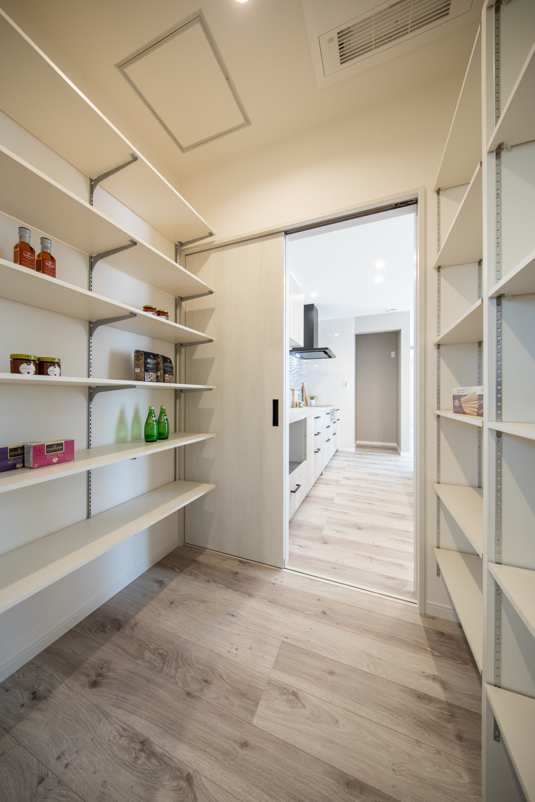 キッチン横には食品がストックできる1.5帖のパントリー。