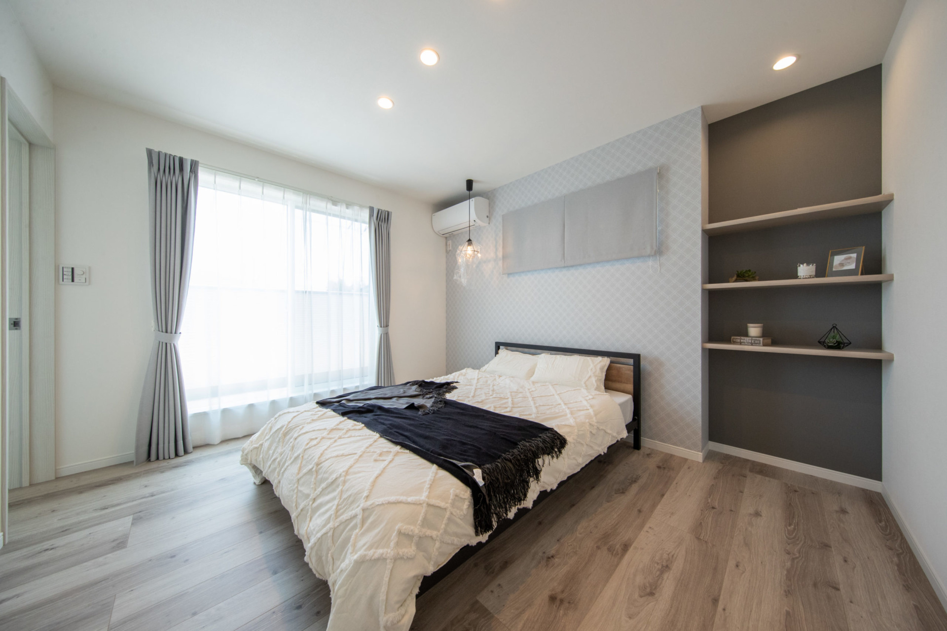 モノトーンと木目でコーディネートされたシックな寝室です。