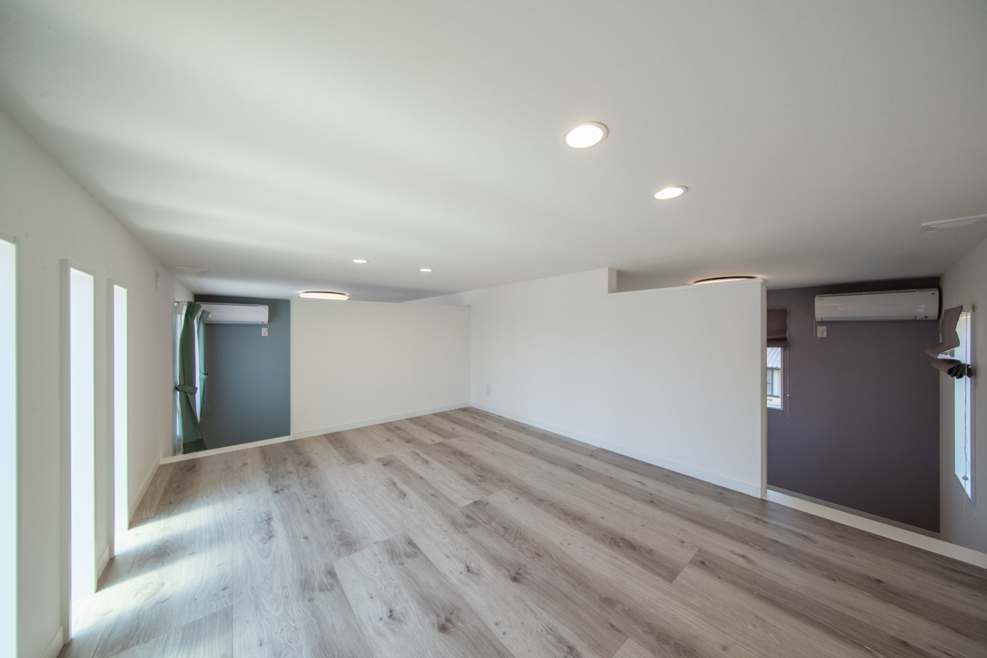 2つの子供部屋がロフトで繋がっており、お子様が小さいうちは行き来しながら遊べる秘密基地のような空間です。将来的に屋根裏収納として3帖ずつに分けて仕切ることができます。