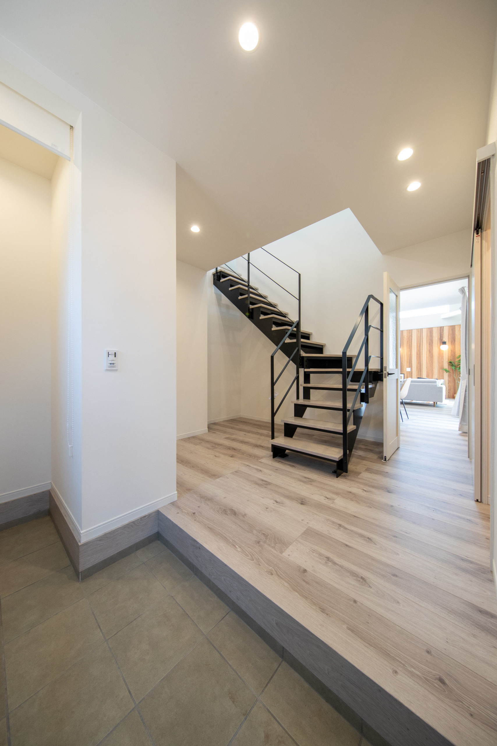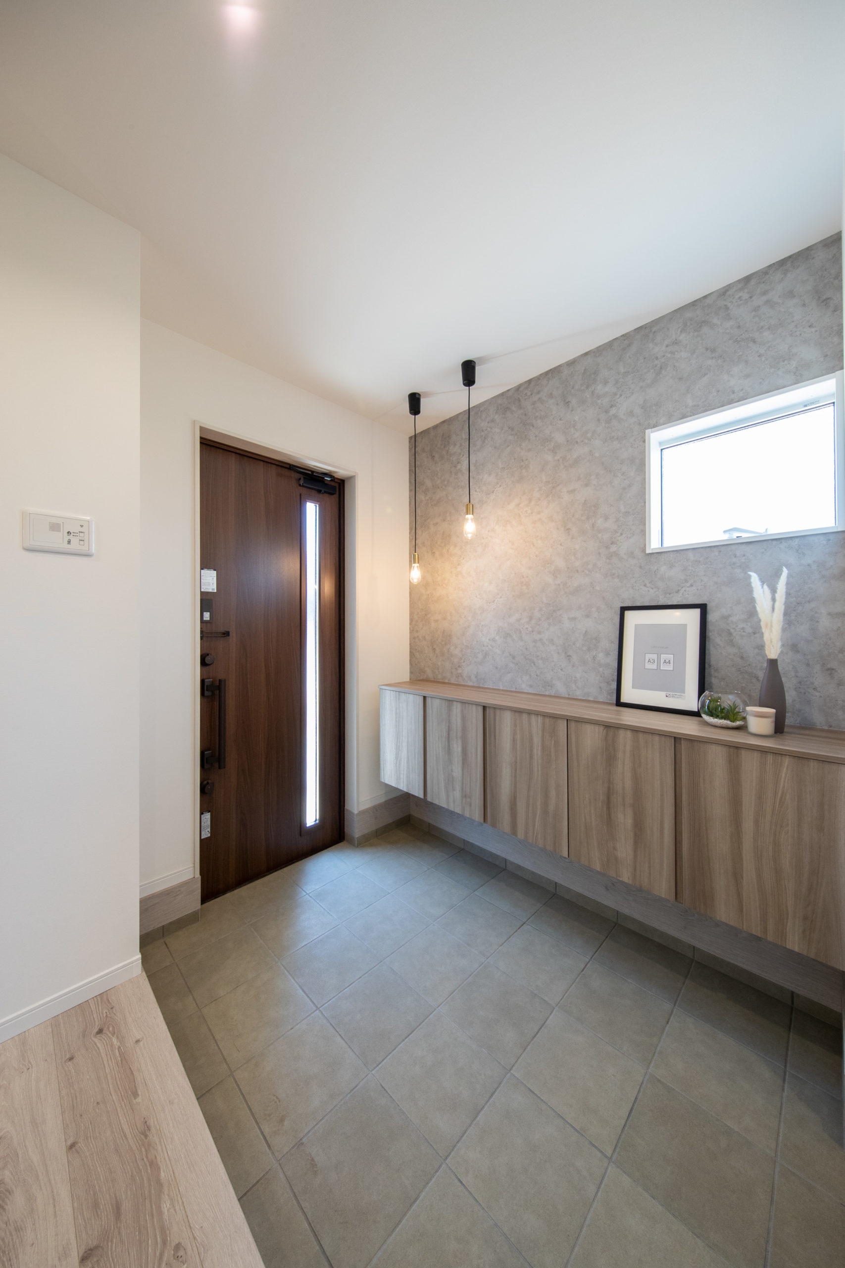 ペンダント照明が印象的な玄関。グレー基調の落ち着いた空間に木目の玄関収納が映えます。