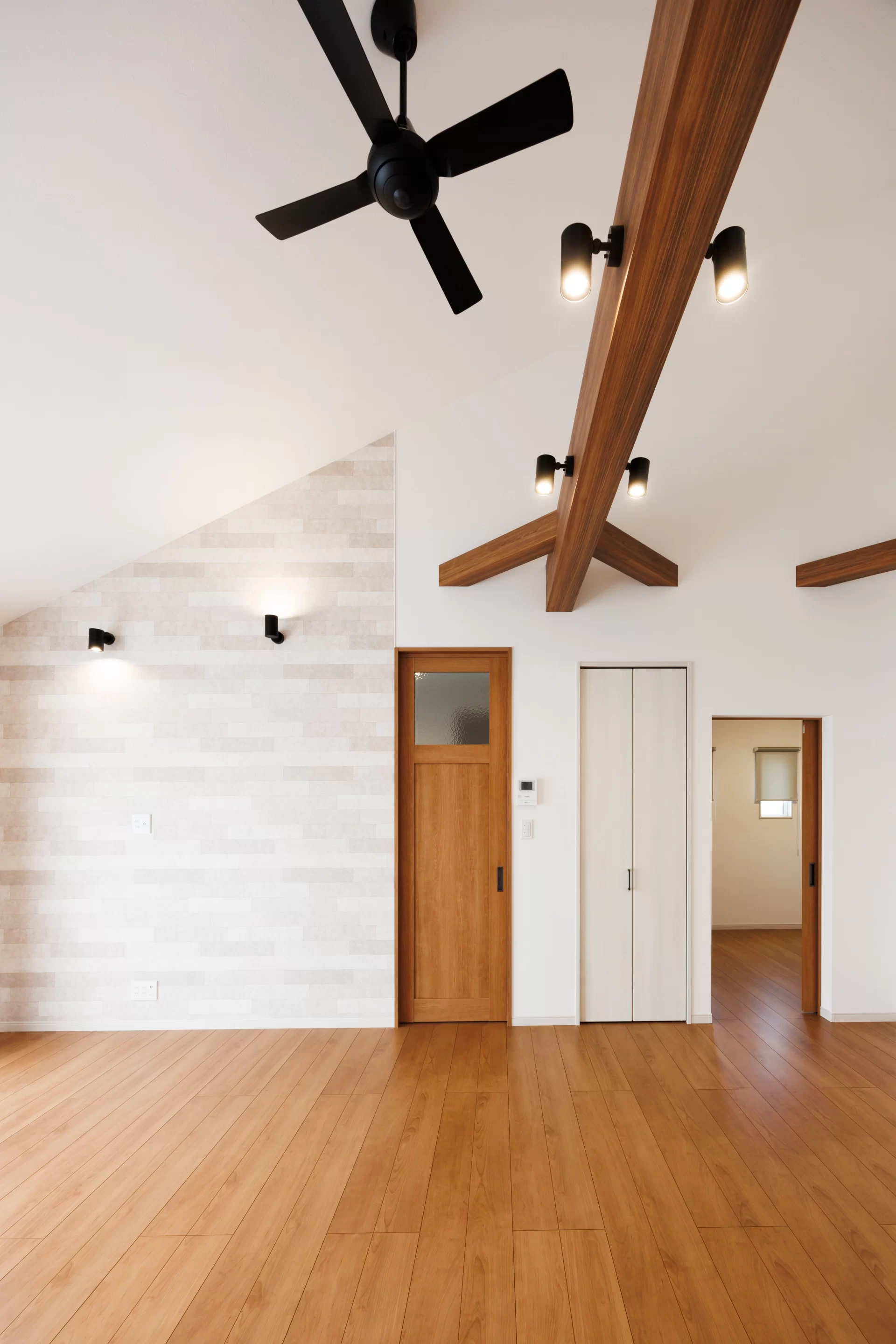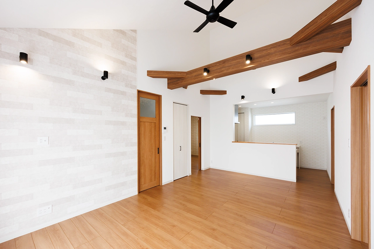 梁と勾配天井が印象的なリビング