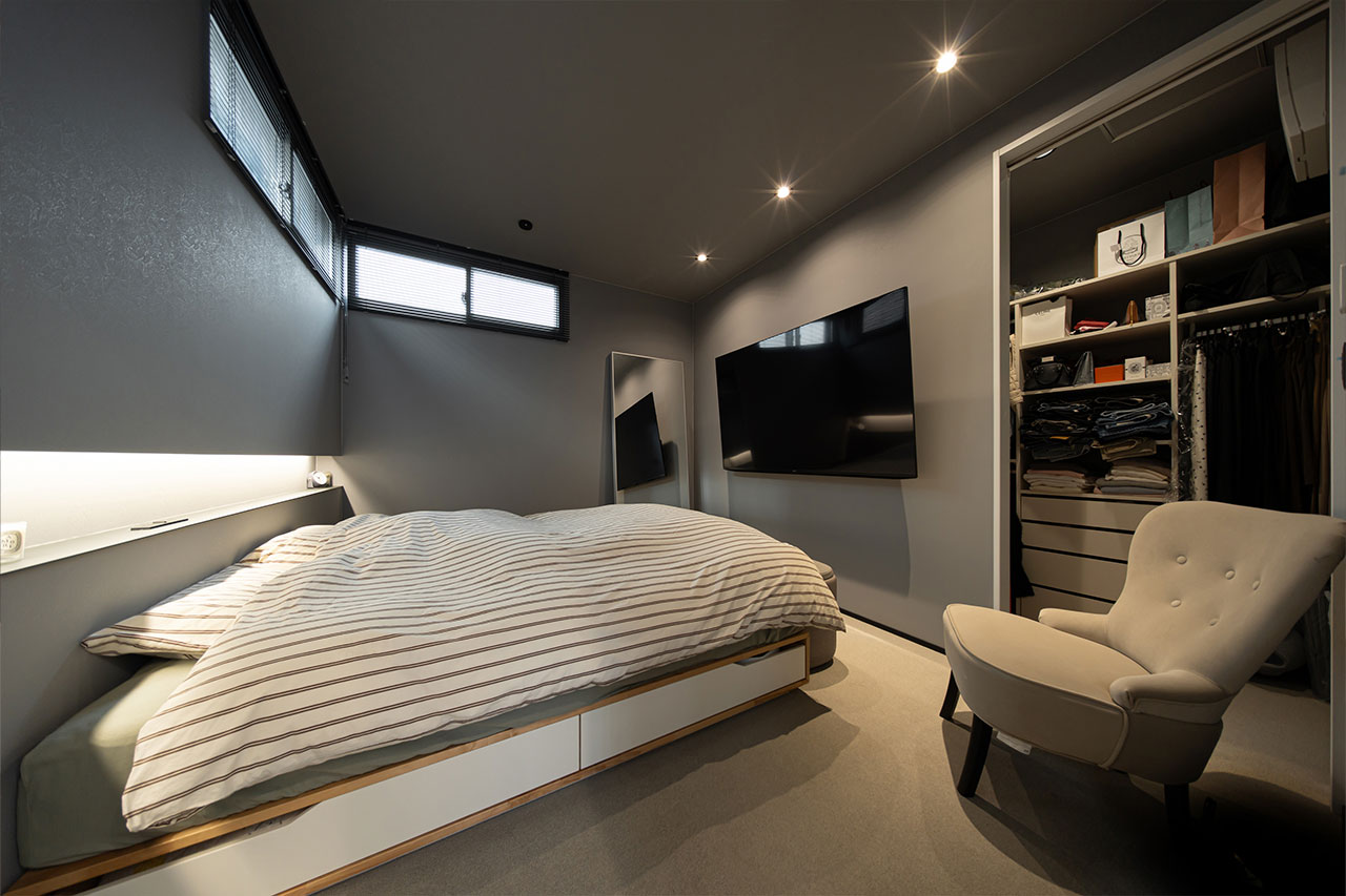寝室のニッチも間接照明を入れて雰囲気良くデザインしてくれただけでなく、高さや位置も細かく気遣ってくれたので、ベッドからスマホに手をのばす距離感も丁度良く、タンブラーも置ける高さで便利です。自分たちでは細かい部分にはここまで気が回らなかったと思うので、好みのデザインだけでなく使いやすさまで考えて提案してもらえたことが良かったです。寝室は防音ルーム仕様にしてもらったので、気兼ねなく映画鑑賞が楽しめるのもいいですね。