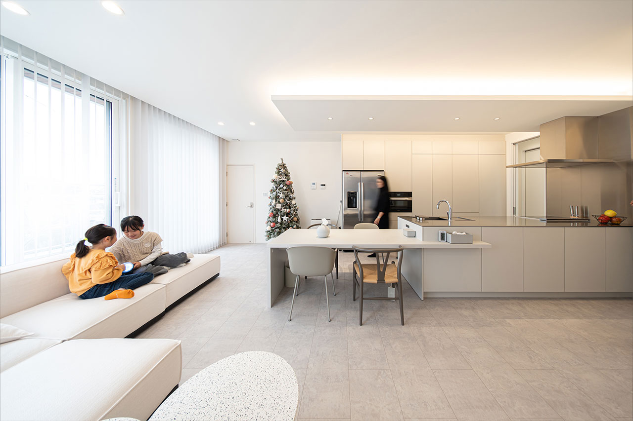 2世帯住宅ですが、玄関も別にしたのでお互い気兼ねなく暮らすことができ、じいじとばあばに会いたいときはすぐに行ける距離感も快適です。家中が暖かく、コタツがいらなくなったので、よりすっきりとした暮らしが実現できたことも嬉しい変化です。LDKはインテリアも含めてこだわり抜いて仕上げたので、たくさん友人を招いてホームパーティを開く楽しみも増えました。