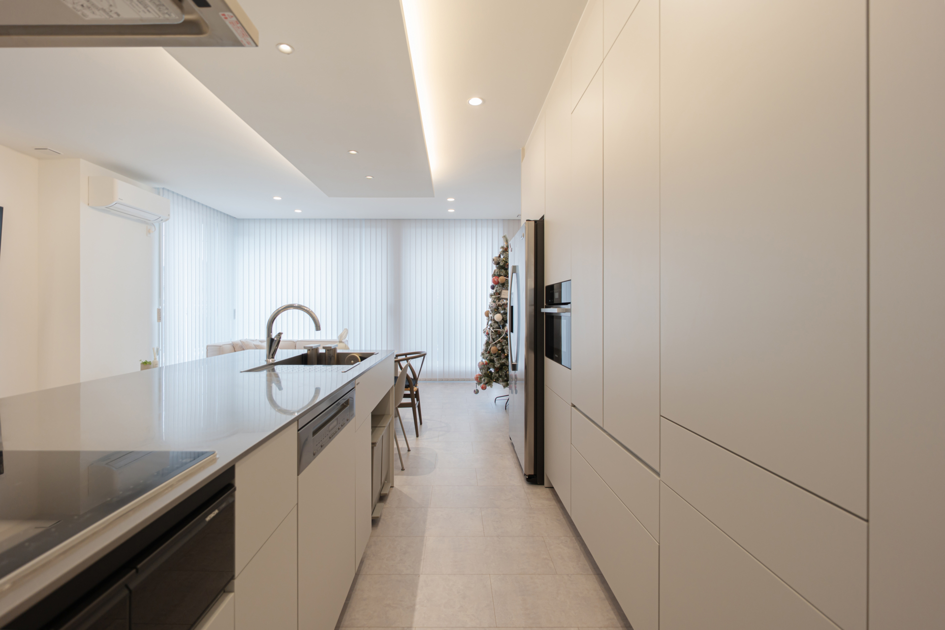 全部がお気に入りですが、LDKとキッチン周りは特にこだわりました。ウォーターディスペンサーつきのmabeの冷蔵庫は絶対欲しかったアイテムで、玄関からは入れられないのでクレーンで吊って窓から搬入してもらいました。いつでも氷入りのおいしい水が飲めるし、遊びに来た友人からも「かっこいい」と褒められます。キッチンのまわりを回遊できる動線や横並びのダイニングも使いやすく、料理も食事もぐんと楽しくなりました。