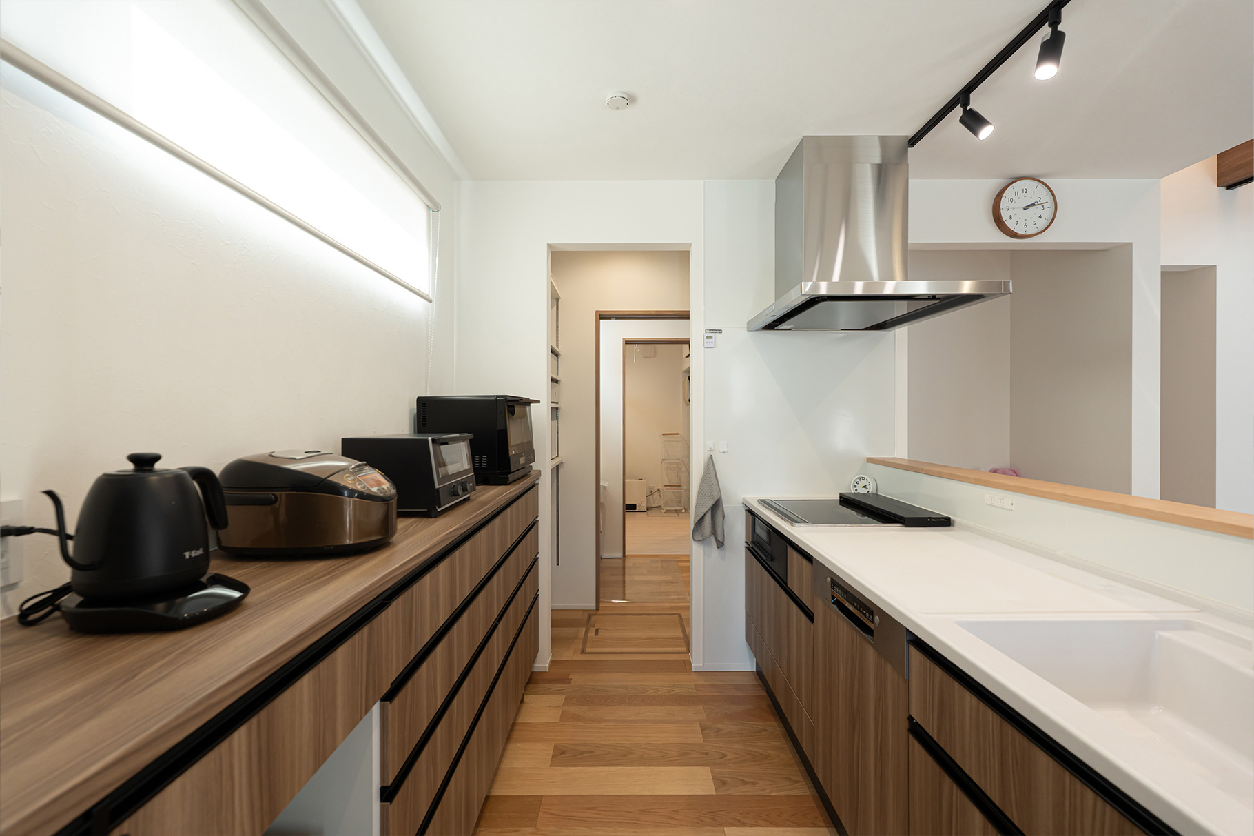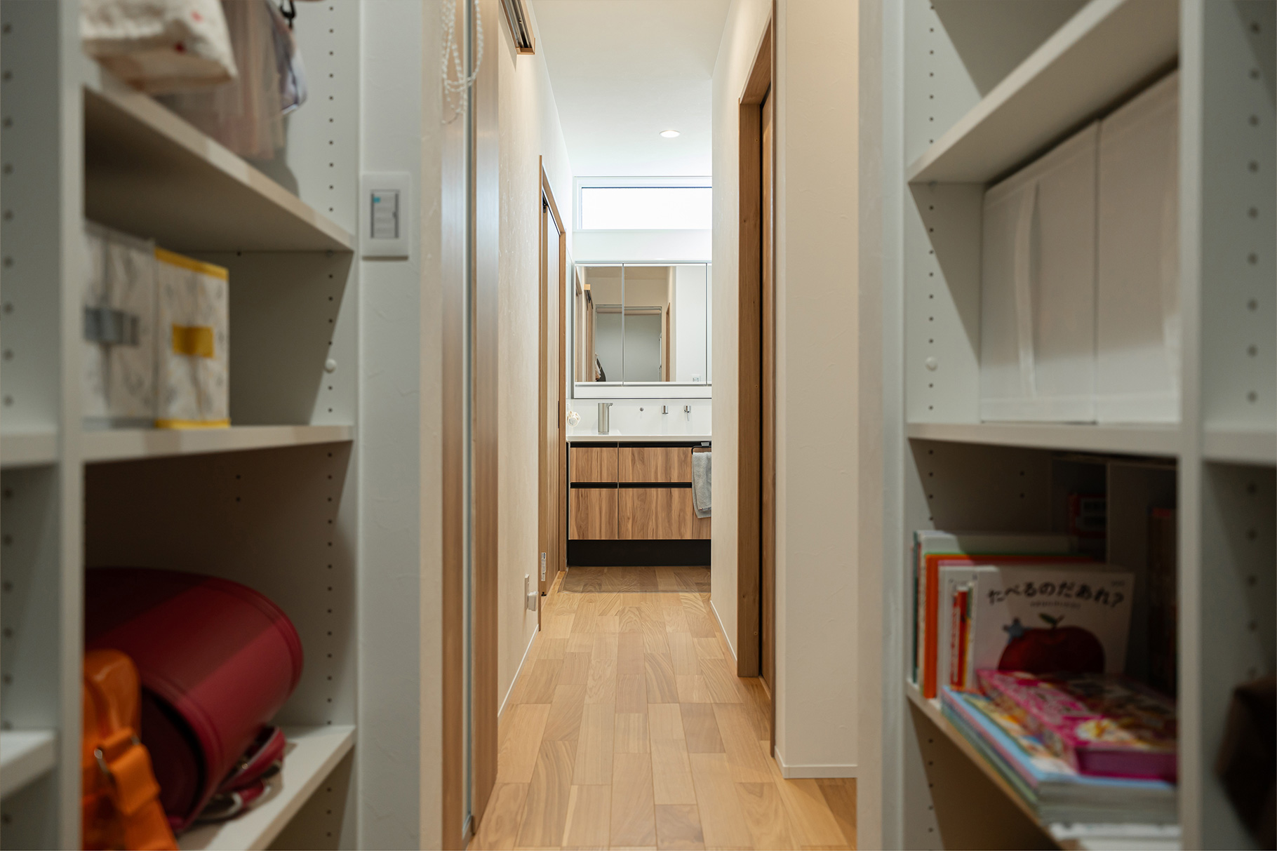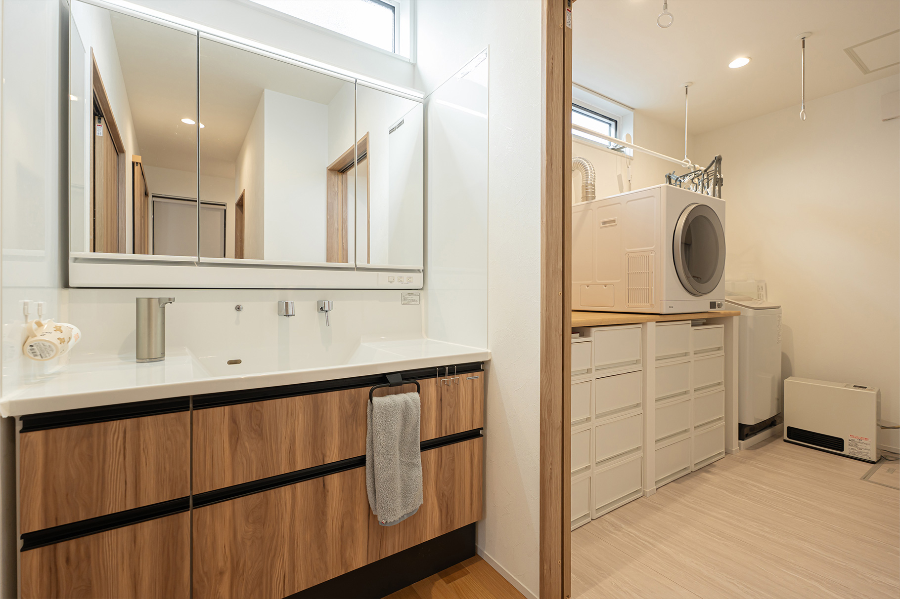 回遊動線や、キッチンから洗面、脱衣室、浴室へつながる動線も意識しましたが、家事ラク以外にも嬉しい効果がありました。脱衣室と洗面が並んでいるので、子どもたちがお風呂上りにそのまま歯を磨いて、髪を乾かしてあげるという流れが自然にうまれたんです。以前の住まいでは、お風呂から出るとどこかへ行ってしまって捕まえるのが大変だったので、動線が整うと生活も整うんだなと実感しています。