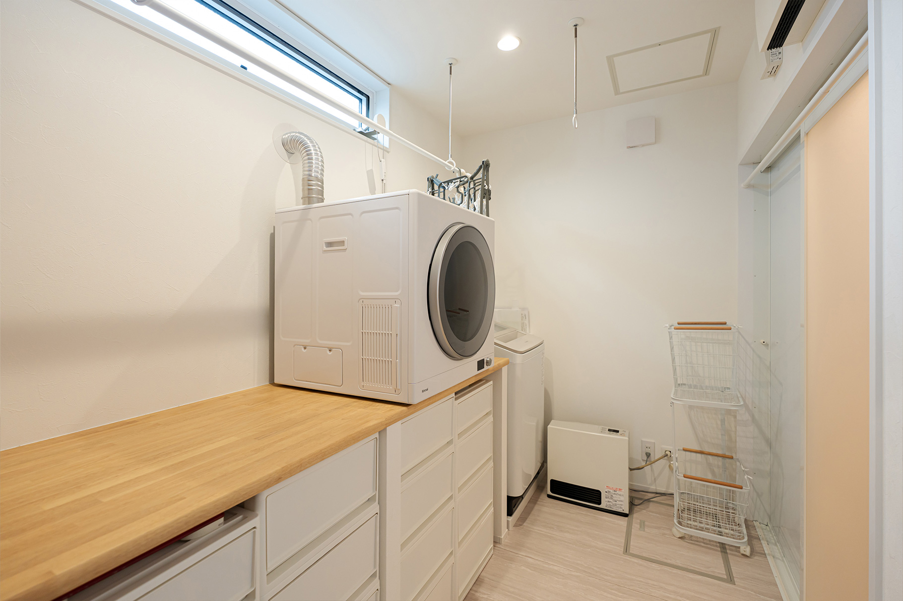ガス乾燥機やBOSCHの食洗器など、家事ラクや時短ができる設備を取り入れたことで時間に余裕がうまれました。脱衣室はランドリールームとしても使えるようカウンターや室内干しをつけてもらったので、洗濯がここで完結するのもすごく便利です。洗濯物をリビングに持っていかなくても済むので、無駄な動きもなくなりリビングもすっきりして気持ちよく過ごせます。