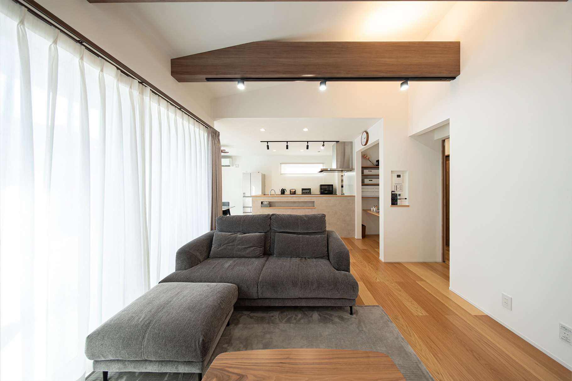 仕事へ行くときはリビングの窓から「行ってらっしゃい」と手を振ってくれ、帰ってきたときもリビングドアを開けるとそこに家族が揃っているので、毎日気持ちがほっこりします。ナチュラルな雰囲気になるよう床は挽板フローリングにしたので、木のぬくもりを感じられるところも気に入っています。