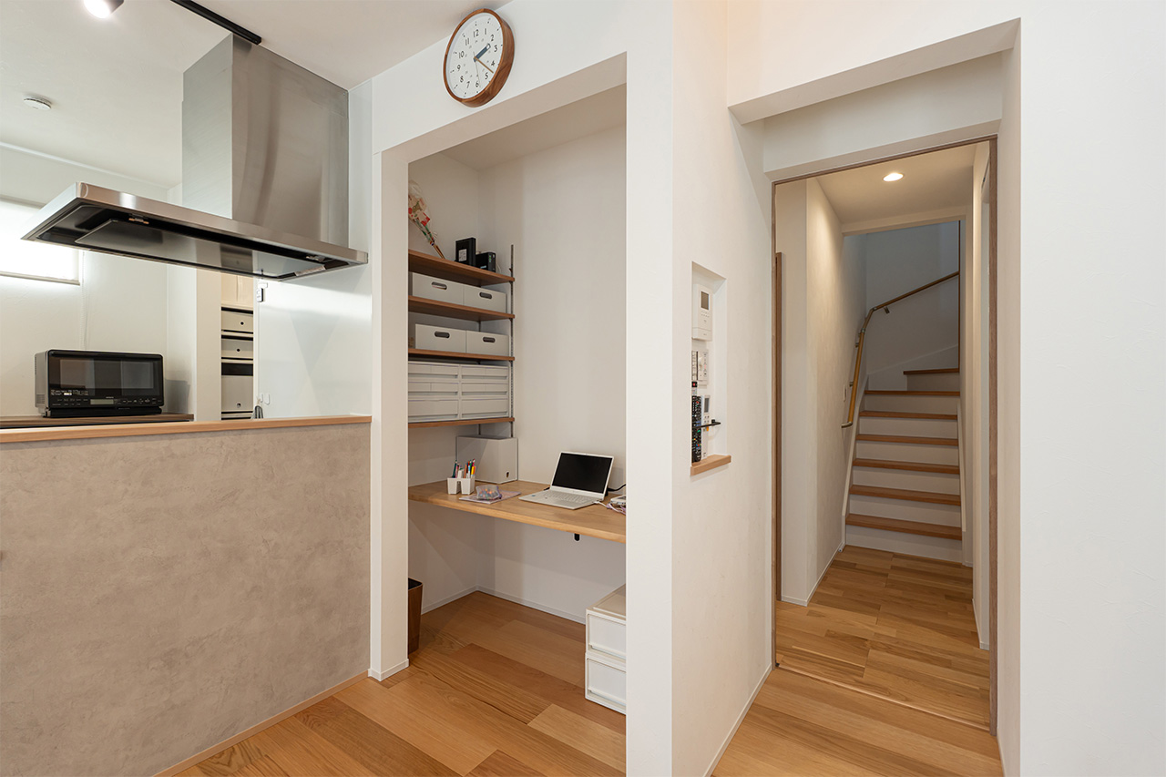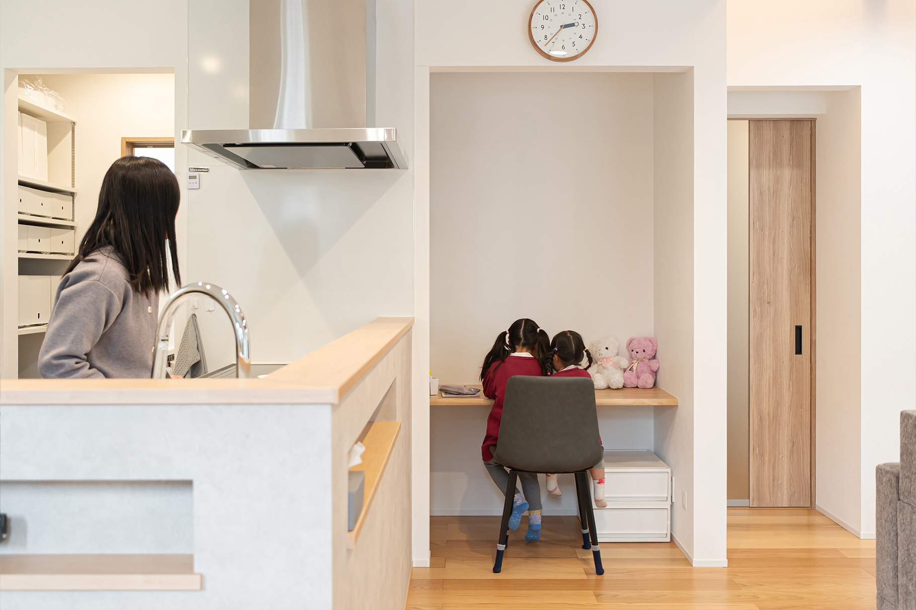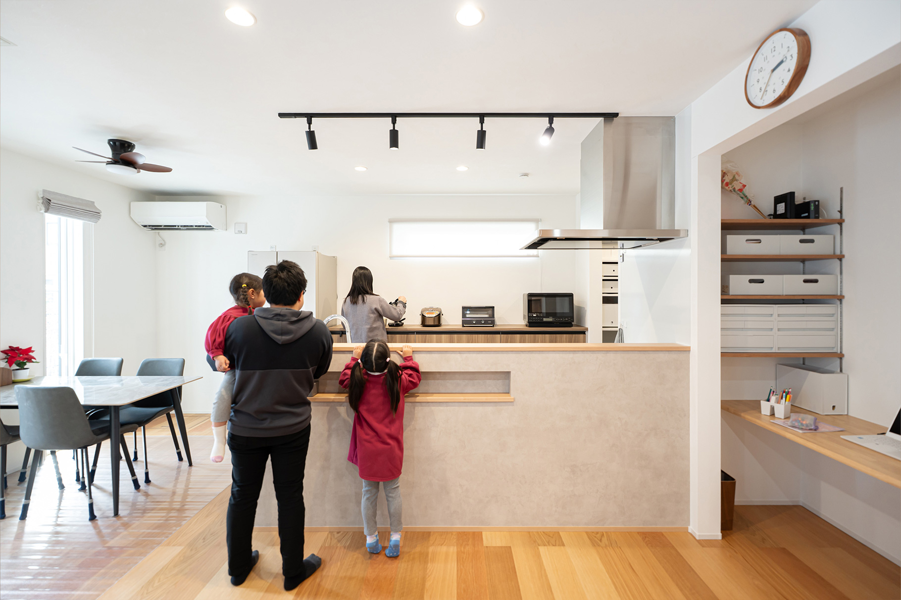 妻も、キッチンからリビングが見渡せるので子どもたちの様子に目が届き、会話しながら食事の支度や片付けができるので、子どもたちとの時間が増えたと喜んでいます。ファミクロやシュークロ、パントリーなど、適材適所の収納にもこだわったので、リビングにものが散らからずすっきり暮らせるのもいいですね。