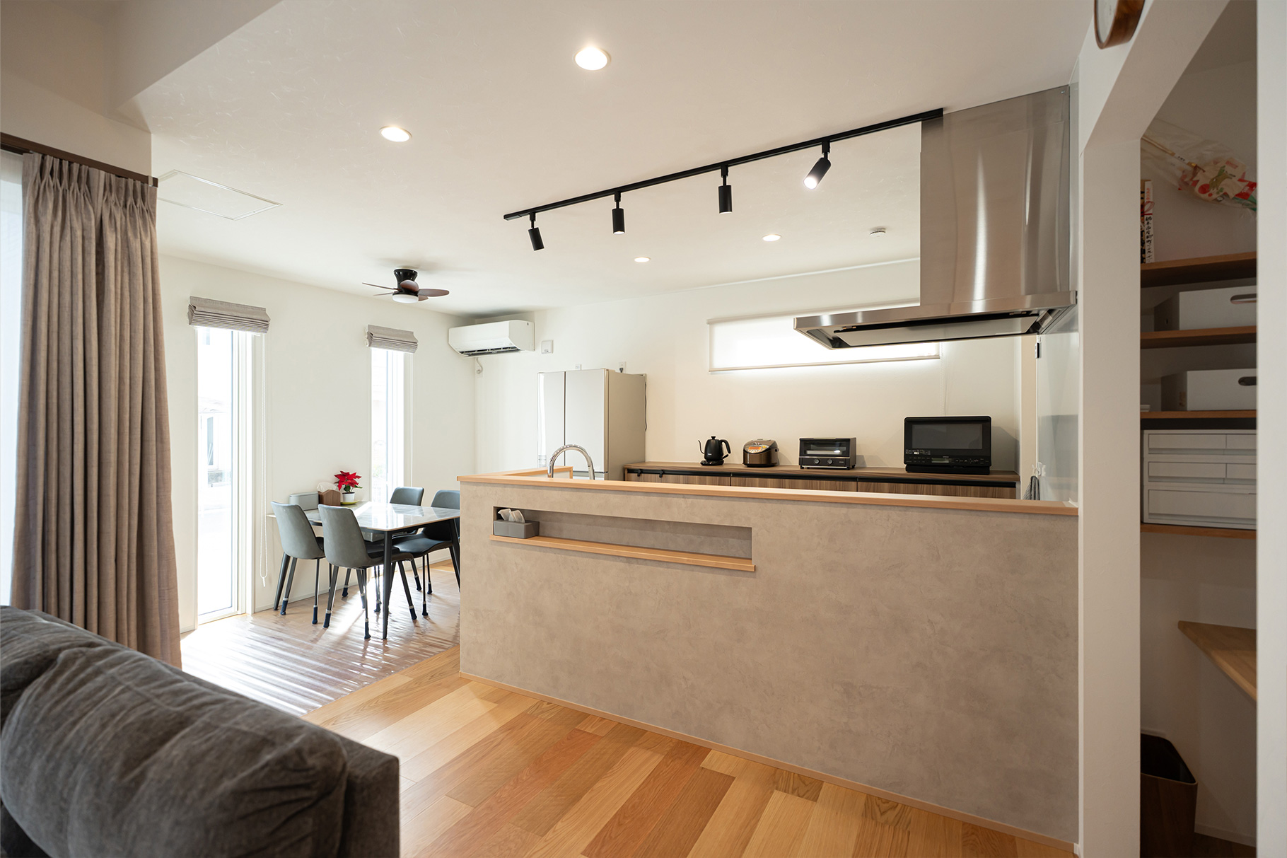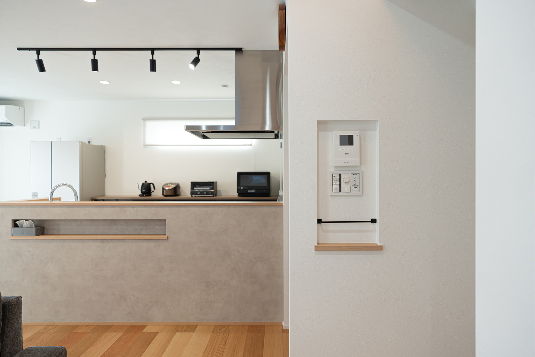 キッチンのデザインは、インスタで見つけたデザインをほぼ完コピしました(笑)。キッチンカウンターにニッチをつけるアイデアもインスタを参考にしたもので、イメージ通りに造作してもらえたので気に入っています。