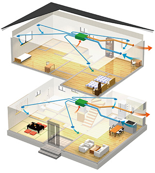 24時間換気システムは、2003年よりシックハウス症候群対策の一つとして建築基準法に定められているシステムです。効率的に24時間(常時)換気する事により、現代の高気密・断熱住宅に起こりやすい結露やカビ、CO2濃度の上昇などの健康阻害を防ぎます。24時間換気システムは、快適な住まいをつくるうえで不可欠になっています。「第一種換気」「第二種換気」「第三種換気」の3つの種類があり、ノーブルホームでは主として第一種換気をご提案しています。